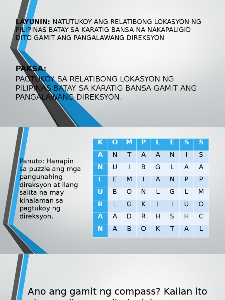 PILIPINAS Sa paksang ito ating alamin ang mga anyong lupa at anyong tubig na nakapaligid sa arkipelagong bansang ang Pilipinas. Nag-aambag rin sa turismo ng Pilipinas ang mga hayop na dito lamang sa ating bansa matatagpuan. Lokasyong Maritime pahina 27 Saan matatagpuan ang bawat katubigan batay sa lokasyon ng Pilipinas 1.