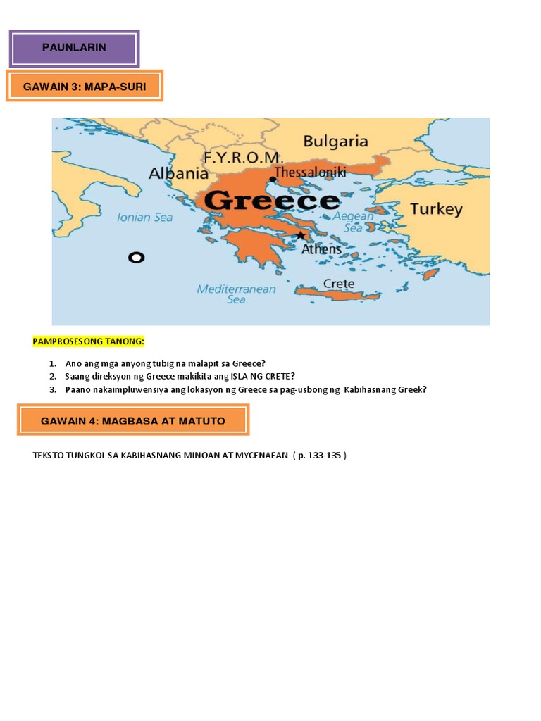 Malaking anyong tubig na makikita sa hilaga ng pilipinas. 3 Pamprosesong mga Tanong 1. Paano nakaimpluwensiya ang okasyon ng Greece sa pag-usbong ng Kabihasnang Greek.